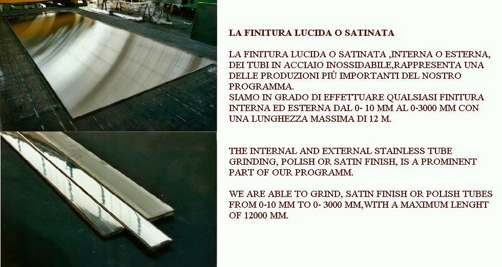 La finitura lucida o satinata ,interna o esterna, dei tubi in acciaio inossidabile,rappresenta una delle produzioni più importanti del nostro programma.